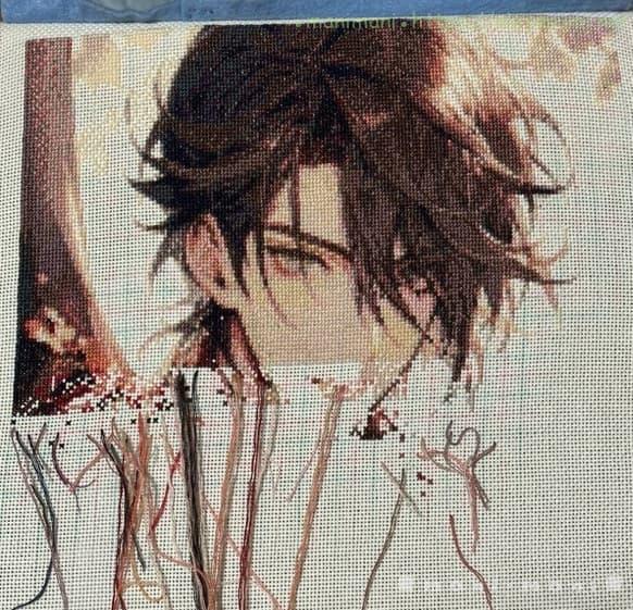 髪の部分やその他でしっかりとした輪郭線がなかったので、顔は陰影とかで描かれるのでしょうか?と疑問に思いながら刺してきましたが、顔の輪郭線が唐突にあらわれました。え、いきなり?向かって右側の頬のあたりがとても違和感。