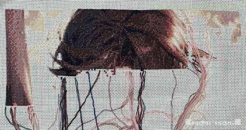穴埋め法の時は図案1枚目を徹底的に刺していましたが、パーキング法に変更したため隣2枚目もぶち抜いて刺すことにし、背景の白以外の箇所を埋めているところです。