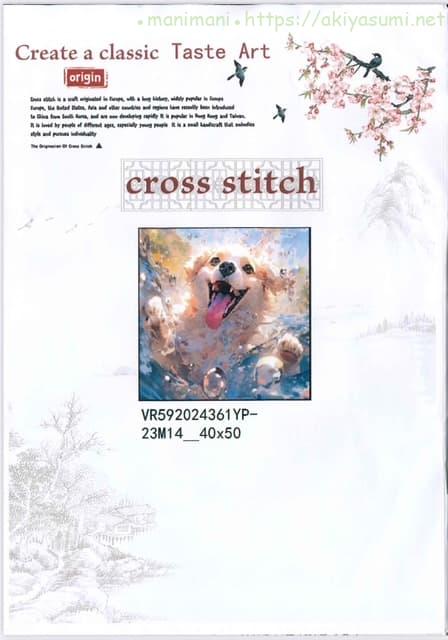 この作品もAmazonさんで購入しました。このスイミングドッグシリーズは18作品があり、いろいろな犬種の子たちが水遊びしているシーンのキットになります。またサイズもS・M・Lと3種類あるので、自分で刺せそうなサイズを選ぶとよいでしょう。