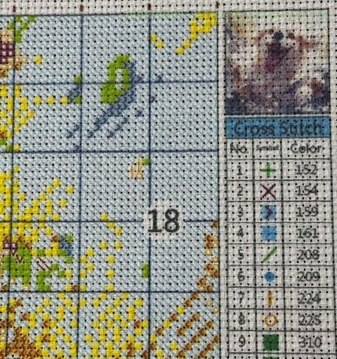 いつもであれば刺している最中に汚れてしまうのが嫌なので、白色は最後の最後に刺すようにするのが自分ルールでした。けれど、背景だけでなくワンちゃんの毛色にも白が入っているため、白色を飛ばすと目を数え間違えそうだったので、今回は白色もしっかり刺しています。大事、臨機応変。