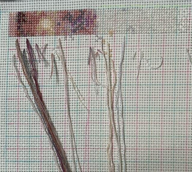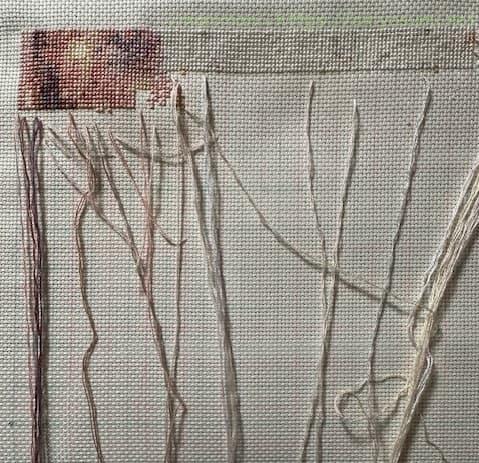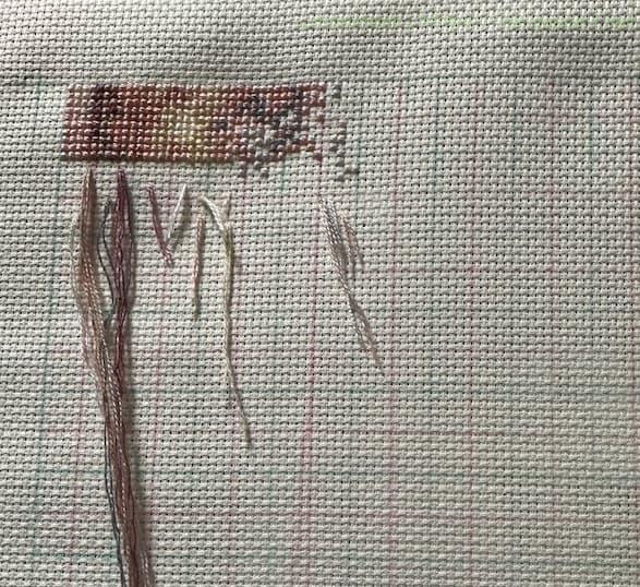 変わらず糸を下の行の次に刺す場所にとどめおくなんちゃってパーキング法方式で刺し進めています。2本取りなので、垂らしておく糸がすごい束になるのが難ですが、糸止めなどをやらないでいい分このやり方が一番楽ちんです。