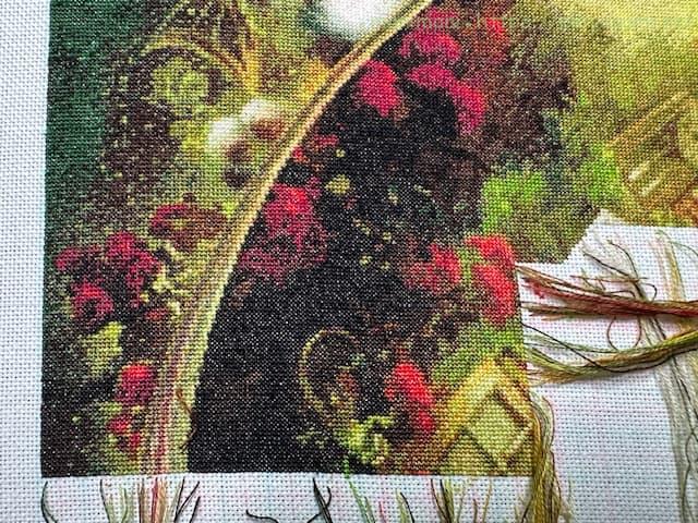 今まで変わり映えない風景画ばかりを刺していましたが、とうとうアリスが登場しました!今までにない色が刺せたのは気分転換になり、またアリスの顔も色々な色で肌や影を刺すことで立体的に見えるのには感動です。