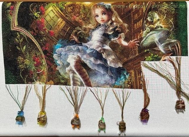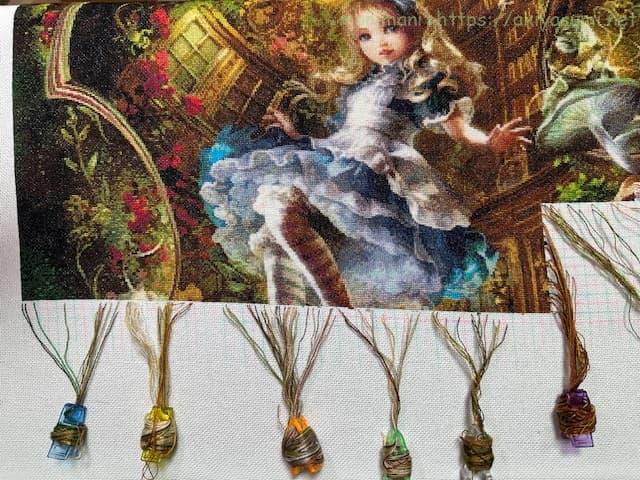 アリスのドレス部分が完全に終わったので、ここでは背景の本棚と芋虫の下に連なるキノコの傘がメインで刺すことになります。