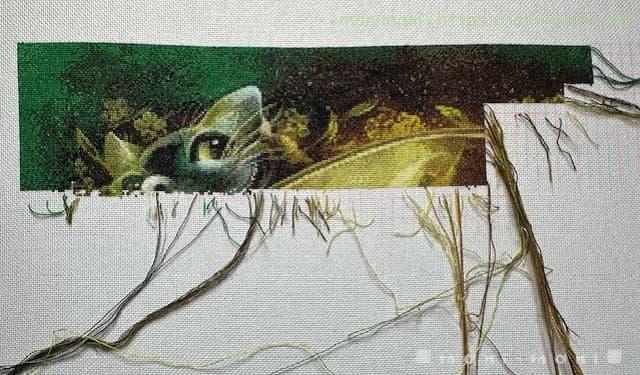 全面刺し作品の初めてのレギュラーサイズなので、刺しても刺しても終わりが全く見えない途方もないサイズの作品です。夜ののんびり時間に刺しているので進みは緩やかですが、楽しく刺しています。