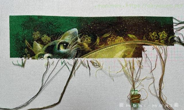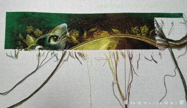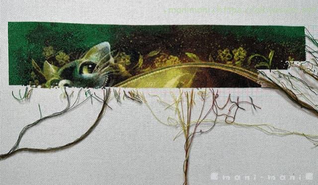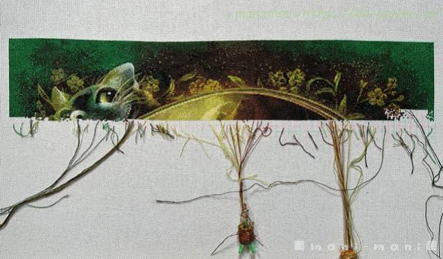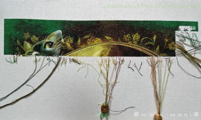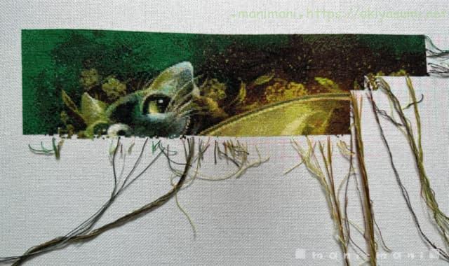 一番天辺を刺しているので、背景の緑と、枠を囲む花や葉っぱを中心に刺し続けています。チェシャ猫を過ぎると変わり映えのない背景が延々続いて少々飽き気味ですが、緑といっても色々な緑の色変えがあるので、少しでも気を抜くと間違える恐れがあります。一度やらかしたので、結構気を遣っています。