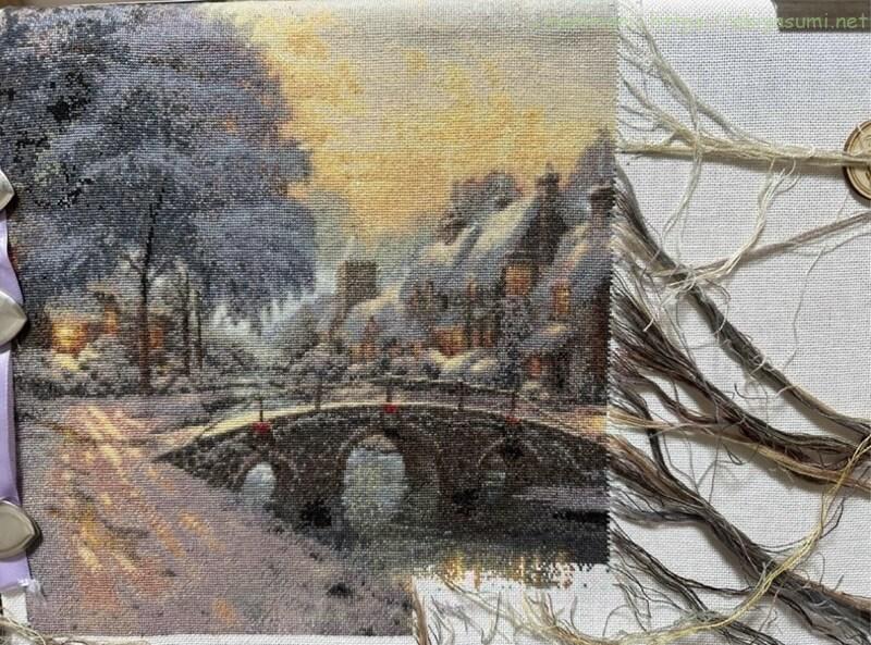 5月が終了しました。川面に家の明かりが映っている箇所をステッチ中です。無駄に糸を使っているわけではないのですが、糸が少なくなって、買い足しをした色が発生したのはこの頃です。不足が出て、糸を買い足すまでポツポツ穴あき状態でした。