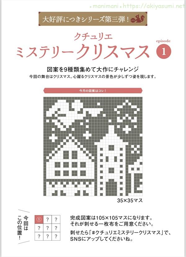 クチュリエのミステリーSALの図案は、一作品全部で9枚となっています。今回のミステリークリスマスもepisode9まで公開予定です。(2024年10月24日全公開済み)