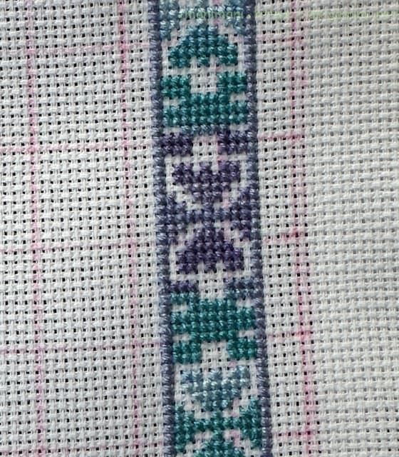 今までは中央のモチーフは一色刺しにしていましたが、それだけだと今回はちょっと寂しくなってしまったので、一部を解いて色を付けてみました。