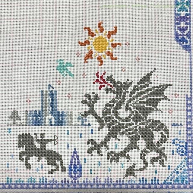 先月のドラゴンを囲むラインのほか、右上と中央とに刺したラインで、何やらスペースが生まれました。どんな図案になるのかワクワクします。