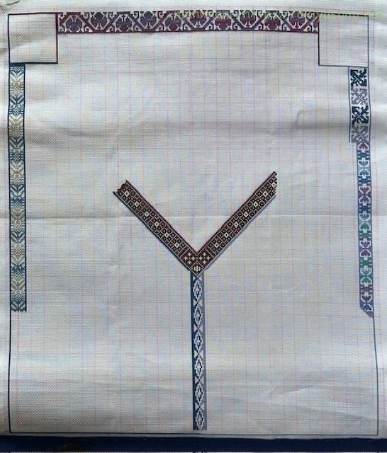 両端のラインをそれぞれ別の色で刺してしまったので、中央のYの字のあたりで2色を合わせて配色するようにしました。