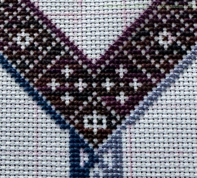 青と緑のグラデーションの人魚の海のその対極に白抜きベタ塗り図案なので、同系色で刺してみました。変に色を変えて浮くよりも、さらに淡い淡青灰系の色がよいかな?ということで。