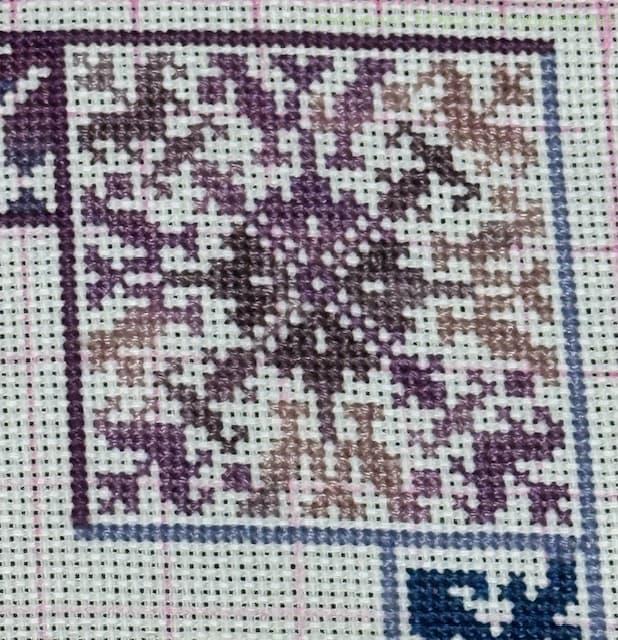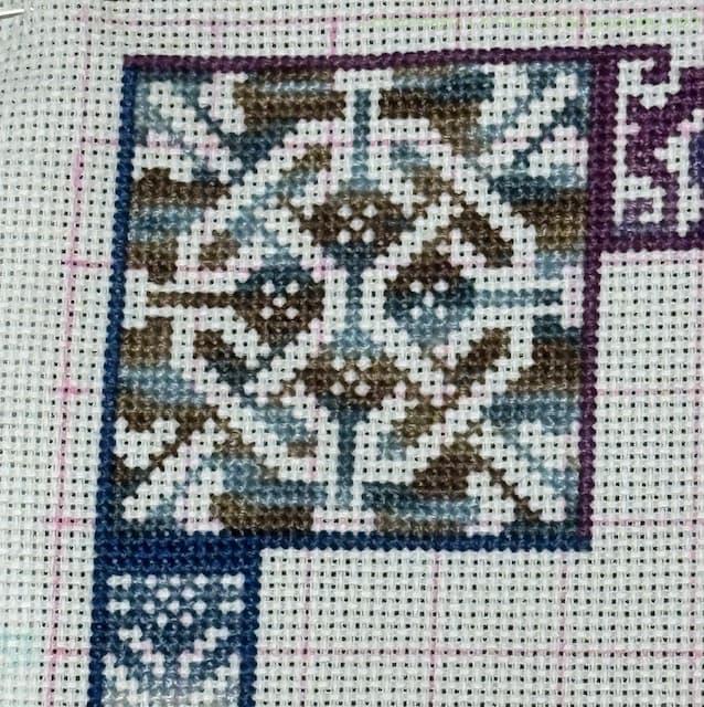 残り僅かなので、余りに余った段染めの糸を使いまくってやる!ということで、三角スペースのなかの英国風っぽい白抜きの柄周りに、紫系や青系の段染め糸をふんだんに使ってみました。