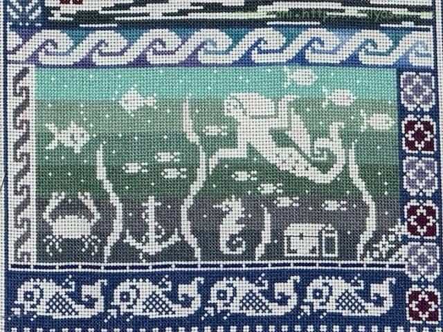 段染めの刺繍糸でグラデーションを作ってみたり、いろいろと挑戦したSALでもあります。ベタ塗りする区画はすごい時間がかかったし、割と広いスペースを取った生物が多かったので、刺しごたえがありました。